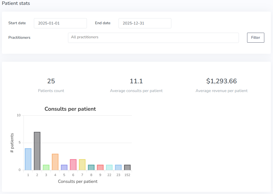• The average number of consults per patient during the specified time range, as well as a chart with the distribution of number of consults per patient